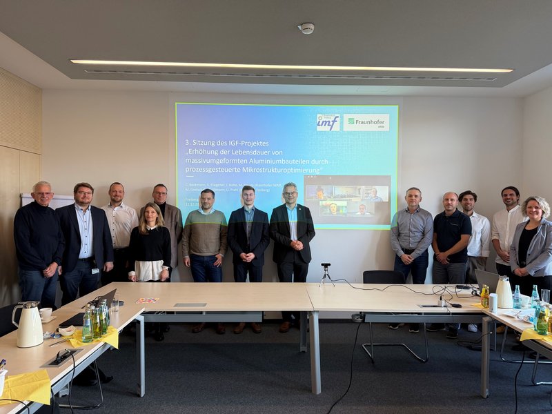 Im Rahmen der dritten Sitzung des projektbegleitenden Ausschusses des IGF-Vorhabens „Erhöhung der Lebensdauer von massivumgeformten Aluminiumbauteilen durch prozessgesteuerte Mikrostrukturoptimierung“ kamen die Projektpartner am 11. Dezember 2025 am Institut für Metallformung der TU Bergakademie Freiberg sowie online zusammen. Die 13 Teilnehmenden vor Ort und die 8 weiteren online haben sich abschließend zu einem gemeinsamen Gruppenbild "zusammengefunden". Ziel der Sitzung war es, den aktuellen Stand der Arbeiten vorzustellen, Ergebnisse zu diskutieren und das weitere Vorgehen abzustimmen.