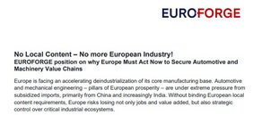 Europa steht vor einer strukturellen Deindustrialisierung seiner Schlüsselbranchen Automobilbau und Maschinenbau. Stark subventionierte Importe – insbesondere aus China – sowie fehlende verbindliche europäische Local-Content-Vorgaben gefährden Wertschöpfung, Arbeitsplätze und technologische Souveränität. Studien prognostizieren massive Produktions- und Jobverluste. EUROFORGE fordert daher ein klares, durchsetzbares europäisches Local-Content-Rahmenwerk, das an öffentliche Förderungen, Beihilfen und Investitionen gekoppelt ist. Ziel ist es, industrielle Wertschöpfung, KMU-Strukturen und Europas strategische Autonomie nachhaltig zu sichern.